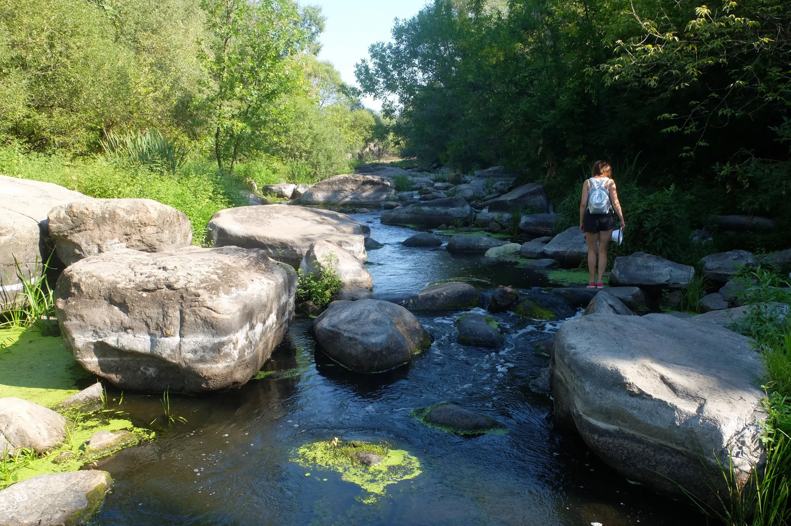 Granite Cliffs: The canyon is formed by massive granite rocks rising above the Hirskyi Tikych River.