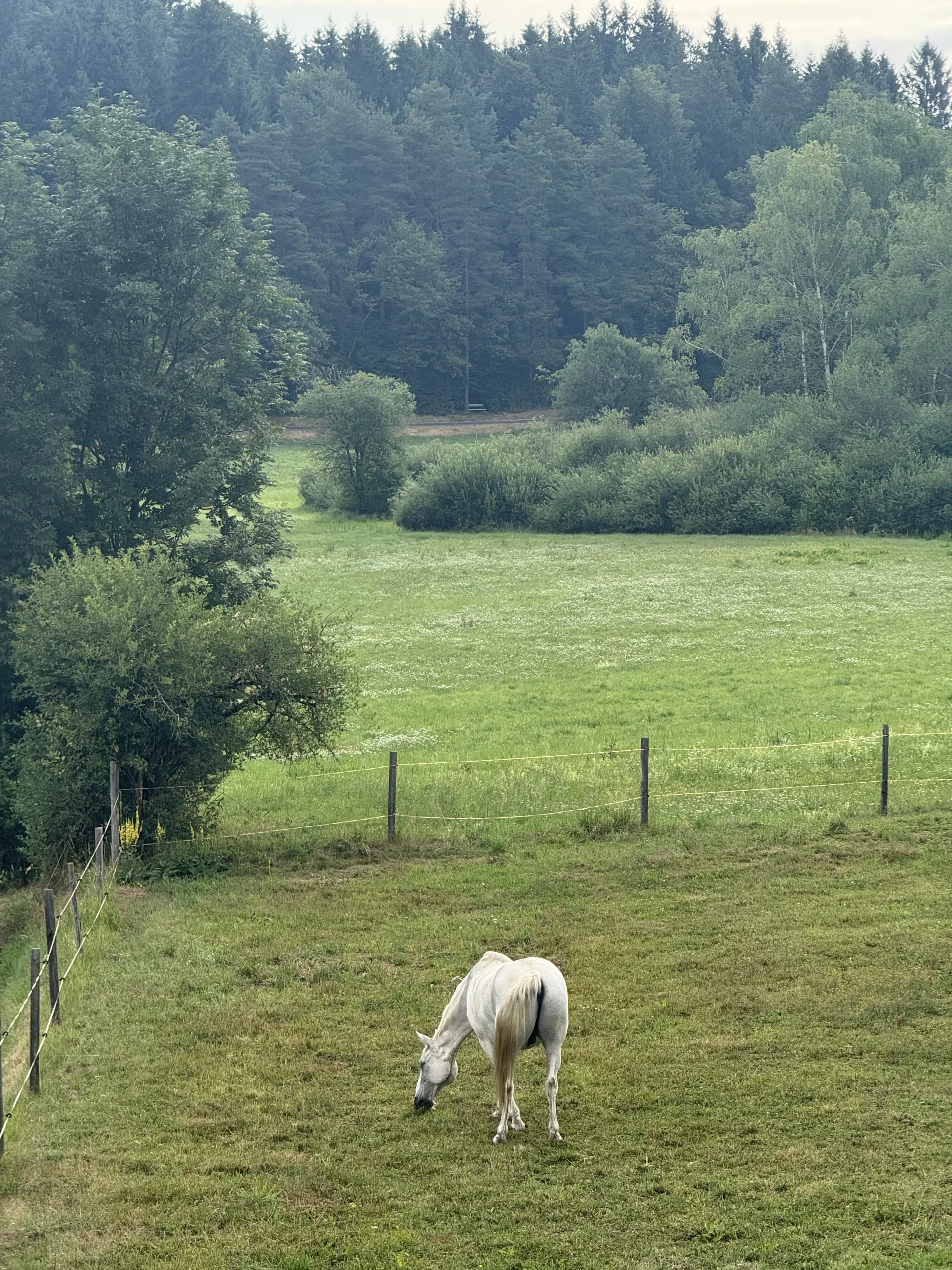 Jeden Morgen begann mit demselben kleinen Ritual: Eine elegante Stute erschien in der Nähe unserer Terrasse, als wollte sie uns persönlich begrüssen. Die Wiesen rund um das Haus strahlten völlige Ruhe aus – Pferde, die friedlich grasten, Gras, das sich im warmen Wind bewegte, und diese unverwechselbar klare Bergluft. Wir spazierten, beobachteten und liessen die Landschaft unseren Rhythmus bestimmen.